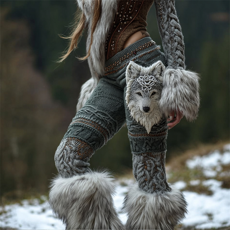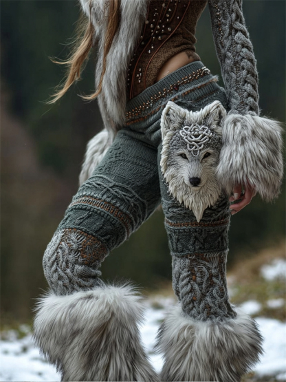 Viking Celtic Fuzzy Wolf Cozy Cable Knit Leggings