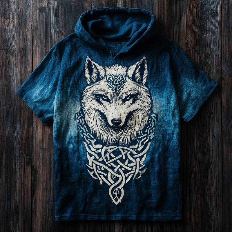 Viking Celtic Wolf Graphic Gradient Hooded Linen T Shirt