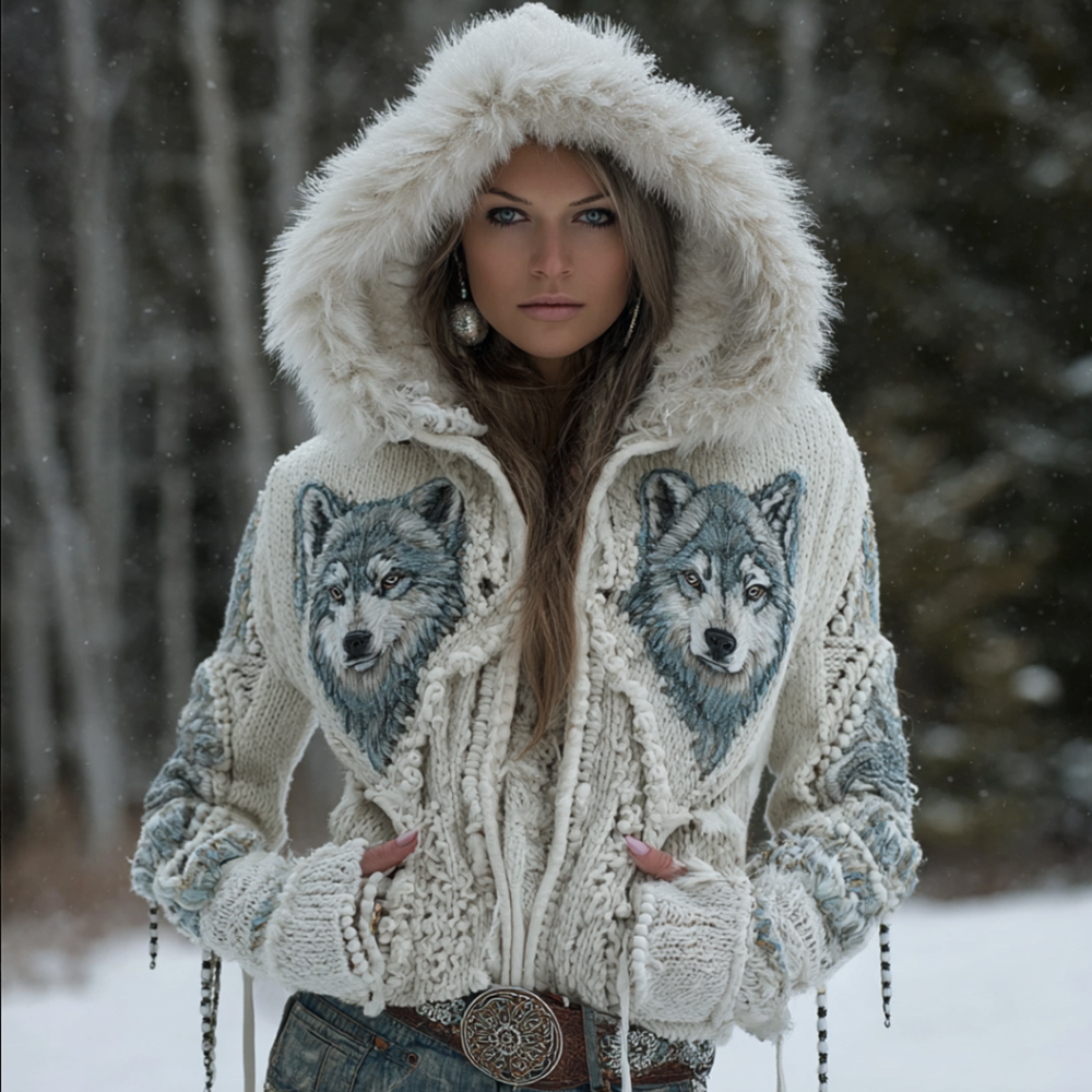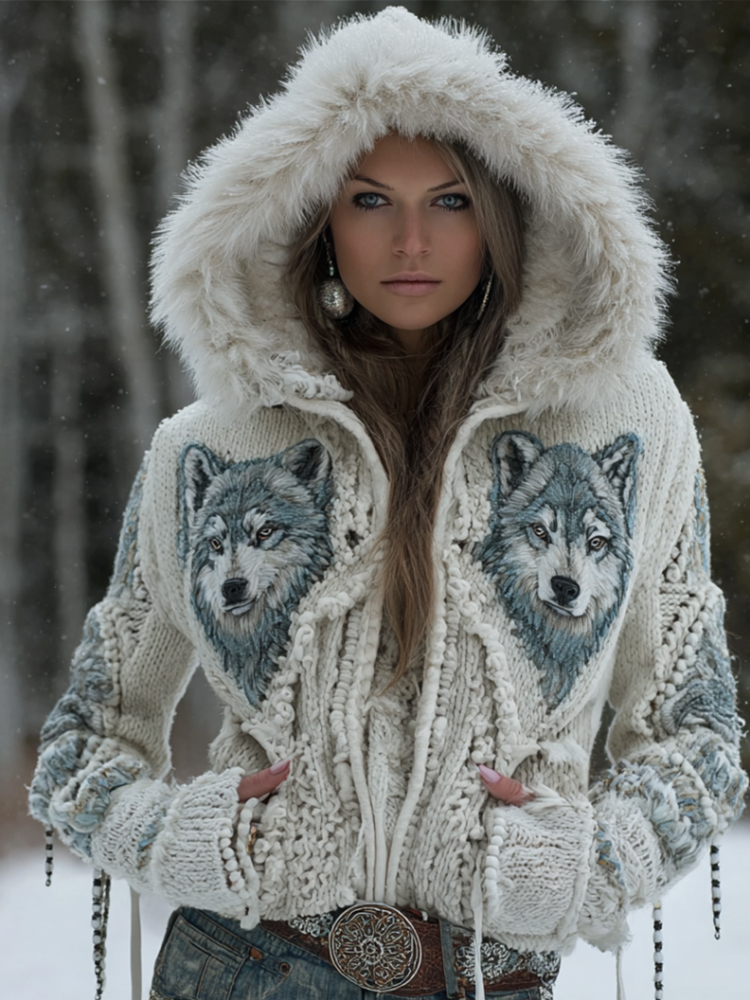Viking Style Three-dimensional Embroidered Wolf Head Cardigan Hooded Sweater