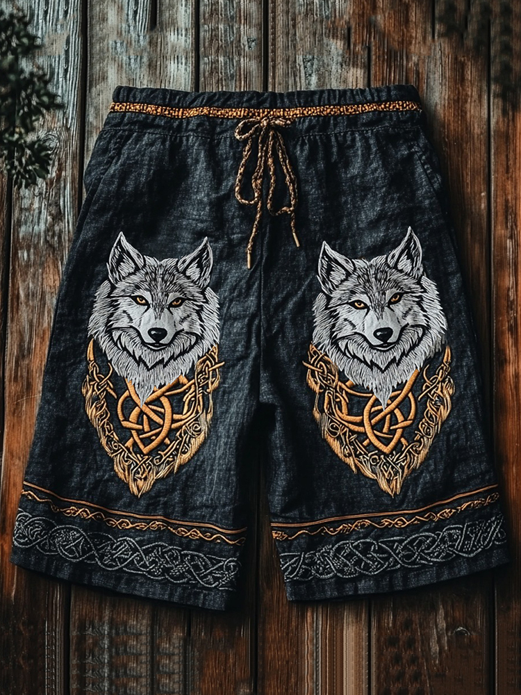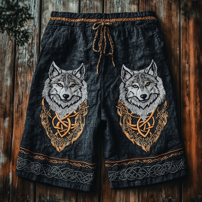 Vintage Viking Wolf Celtic Knot Art Linen Shorts