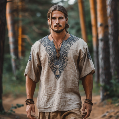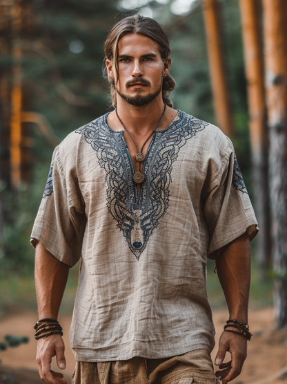 Vintage Viking Wolf Celtic Print Linen V-neck Shirt