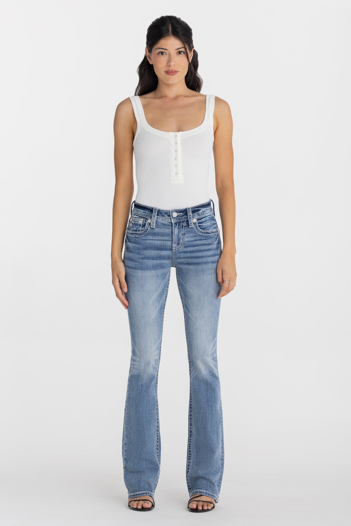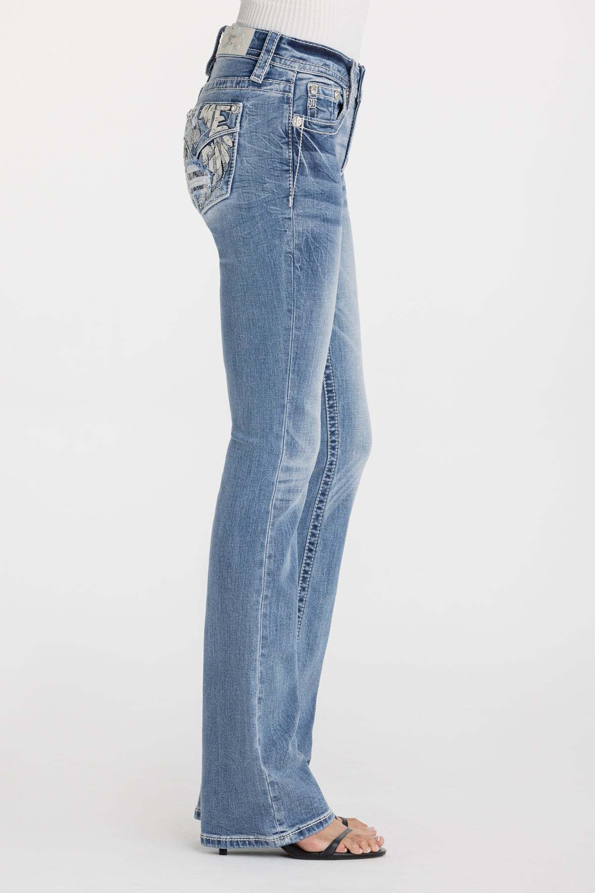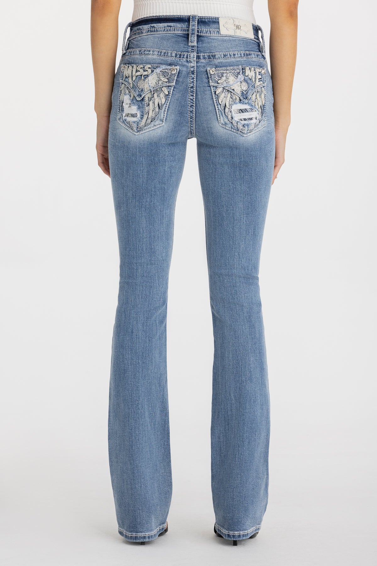 - Embossed white leather cross Miss Me brand patch