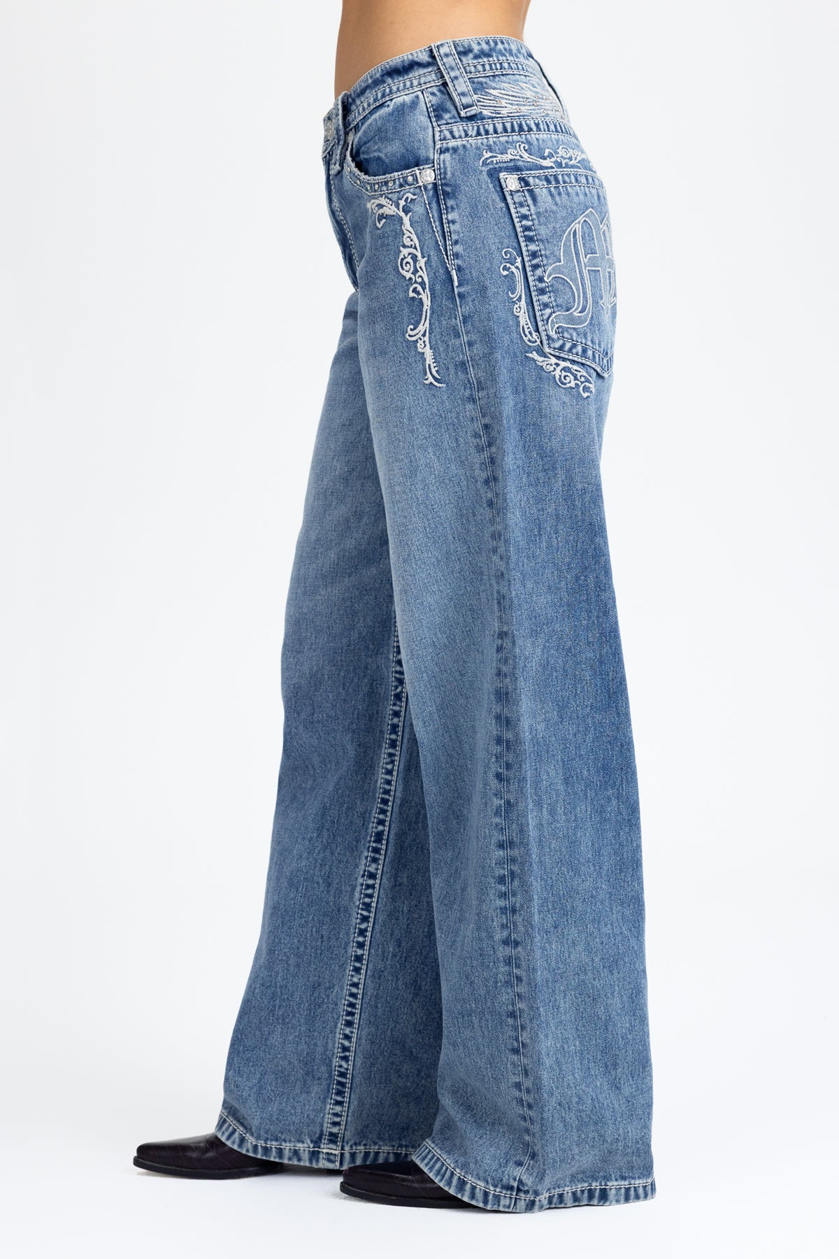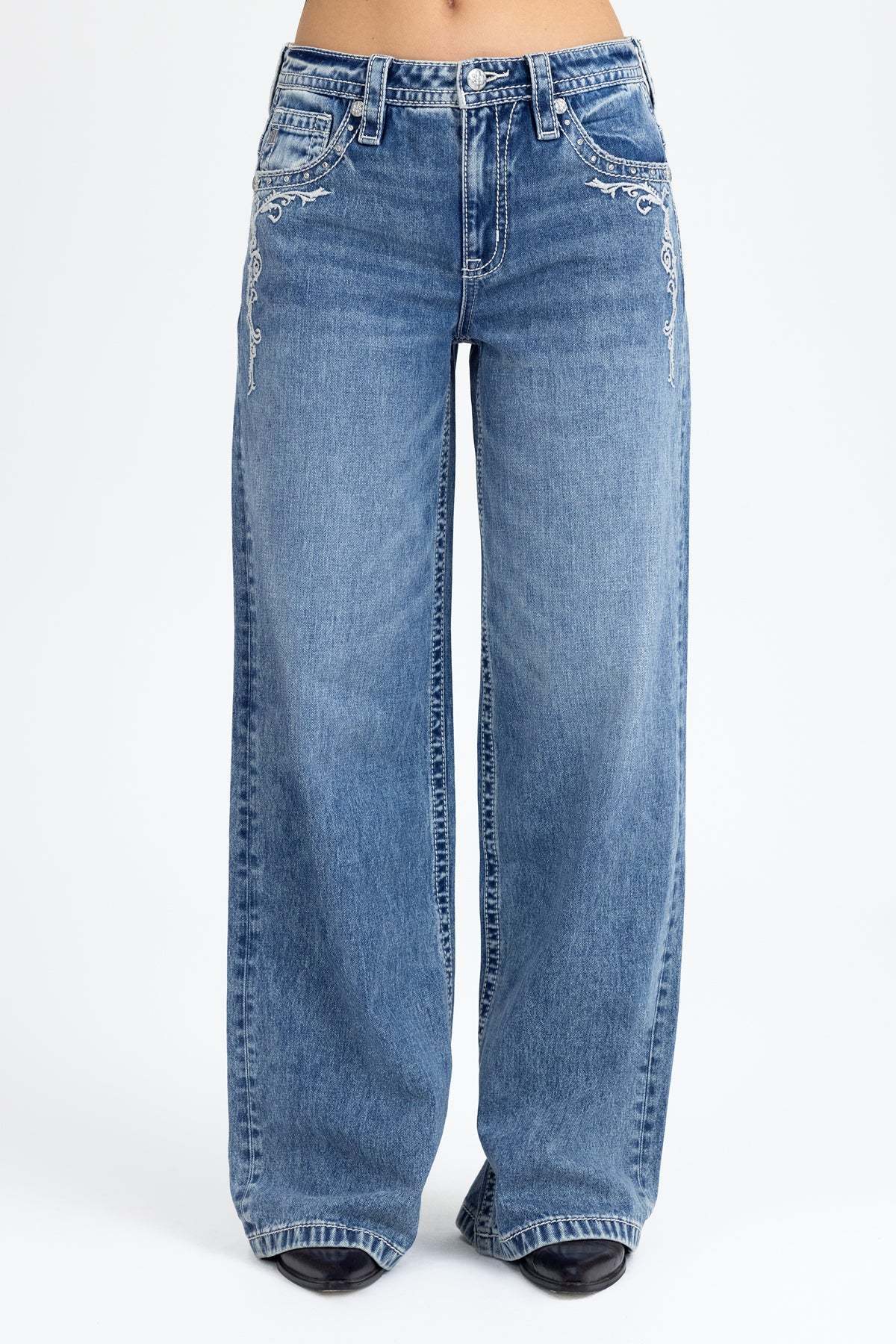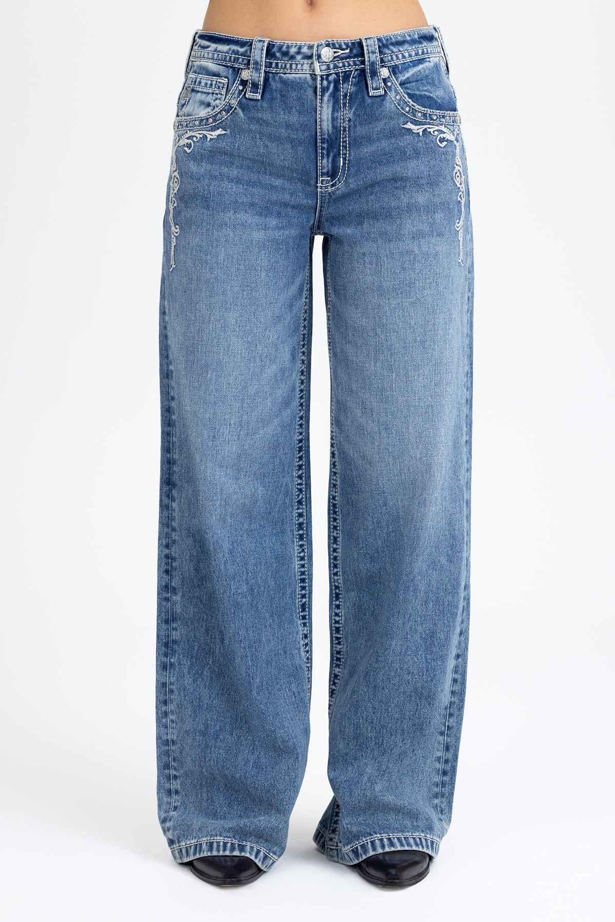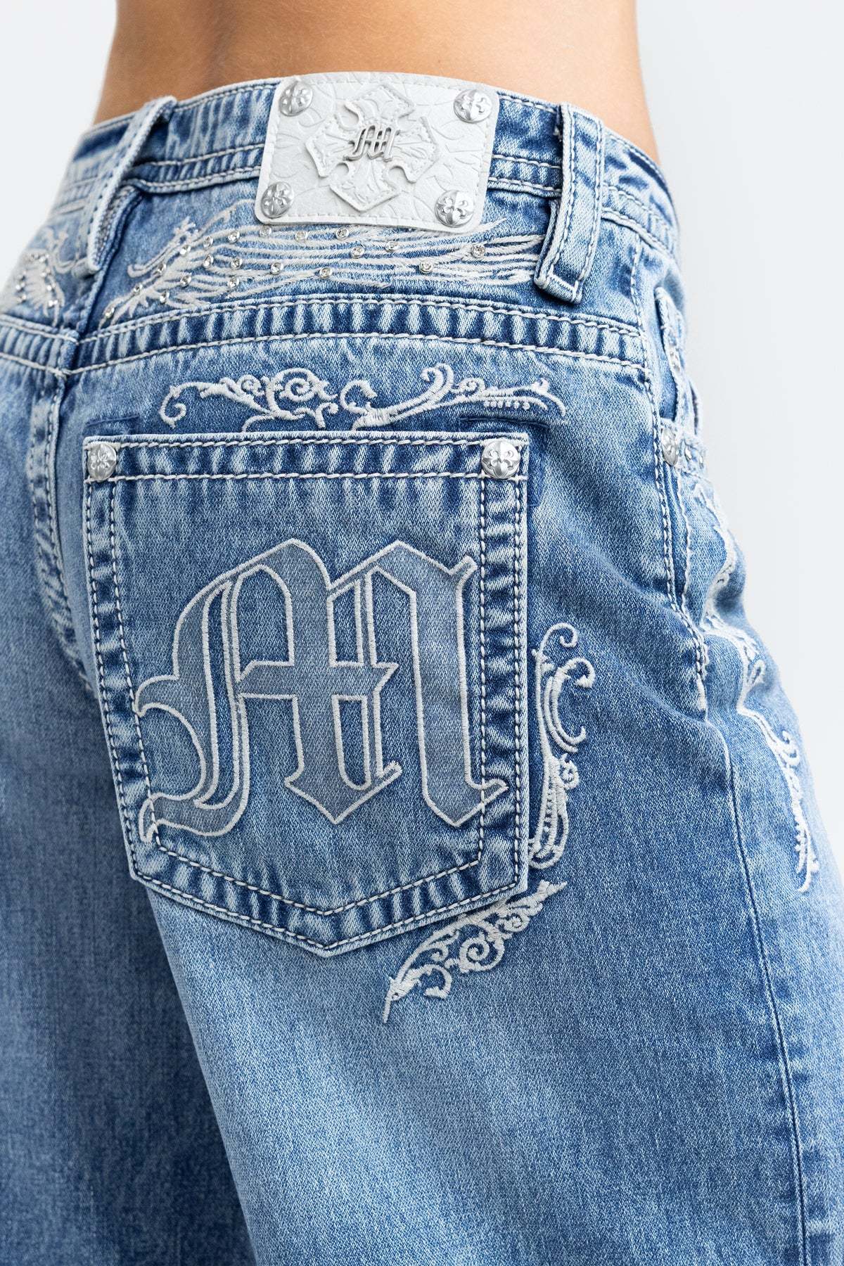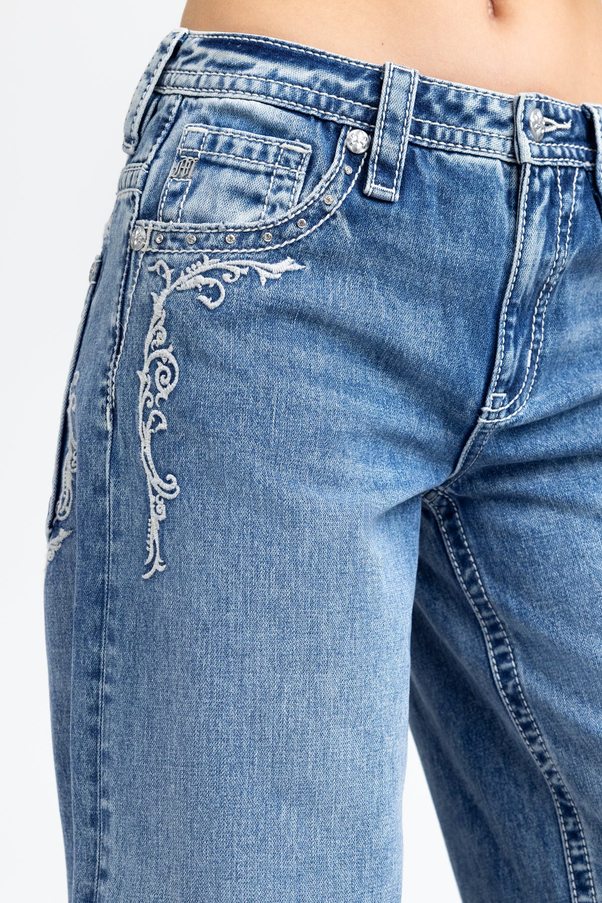 - Embossed white studded leather Miss Me brand patch