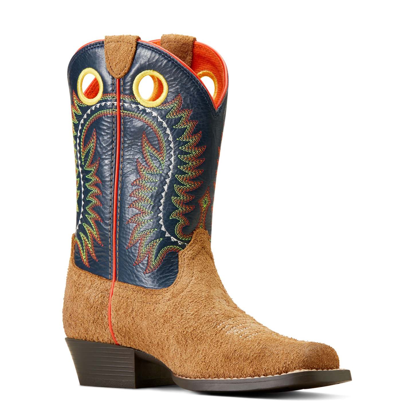 Ariat Kids Tan Roughout Derby Monroe Western Boots4LR™ technology provides lightweight support and stability Removable Wiggle Room™ insole provides up to a half size of extra room Duratread™ sole is extremely durable while still letting your foot flex Five-row stitch pattern with embroidery Pull holes 9" shaft height Riding Heel 1.125" heel Cutter Toe