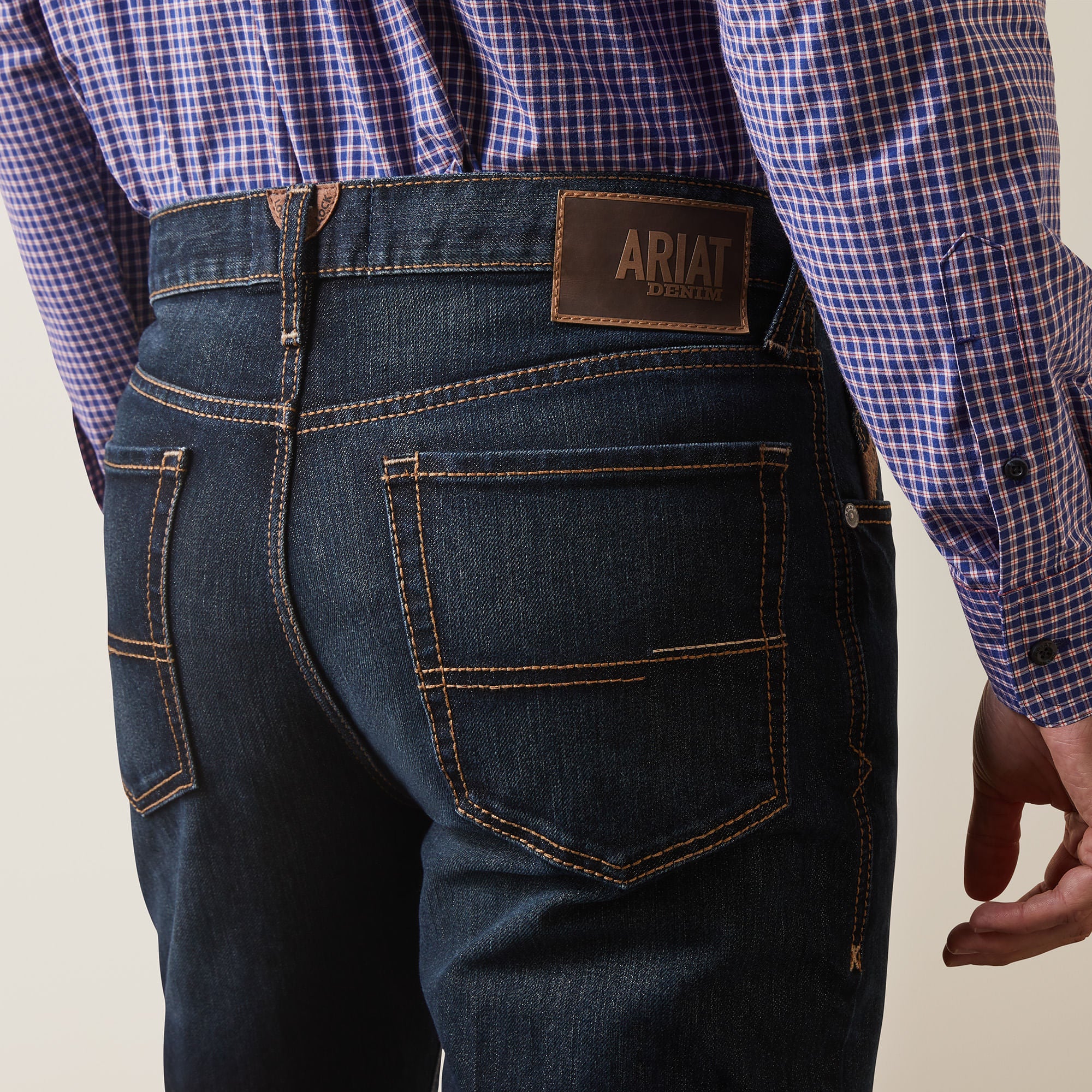 Ariat Mens M4 Hansen Boot Cut JeansNo-rub comfort inseam Anchored belt loops Heavy-duty zippers and hardware Extra deep front pockets Relaxed through waist, hip and thigh Sits lower on the waist Classic boot cut Stretch 67% Cotton, 32% Polyester, 1% Spandex Durable fabric