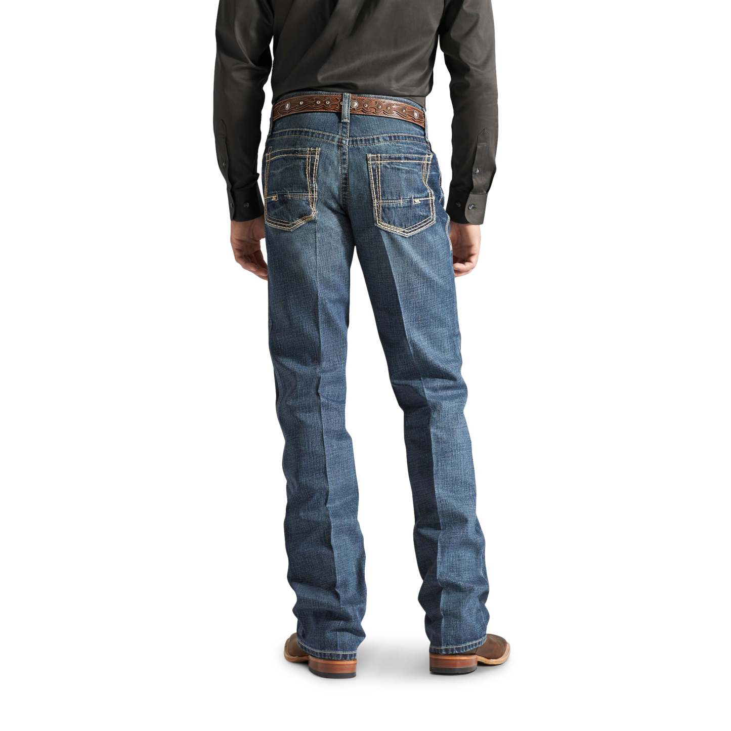 Ariat Mens M4 Low Rise Boundary Boot Cut JeansRelaxed through waist, hip and thigh Low rise Fashion boot cut 13 oz ring-spun denim Medium wash with hand sanding and whiskers No-rub comfort inseams Anchored belt loops Heavy-duty zippers and hardware Extra deep front pockets 100% cotton Machine wash cold Imported