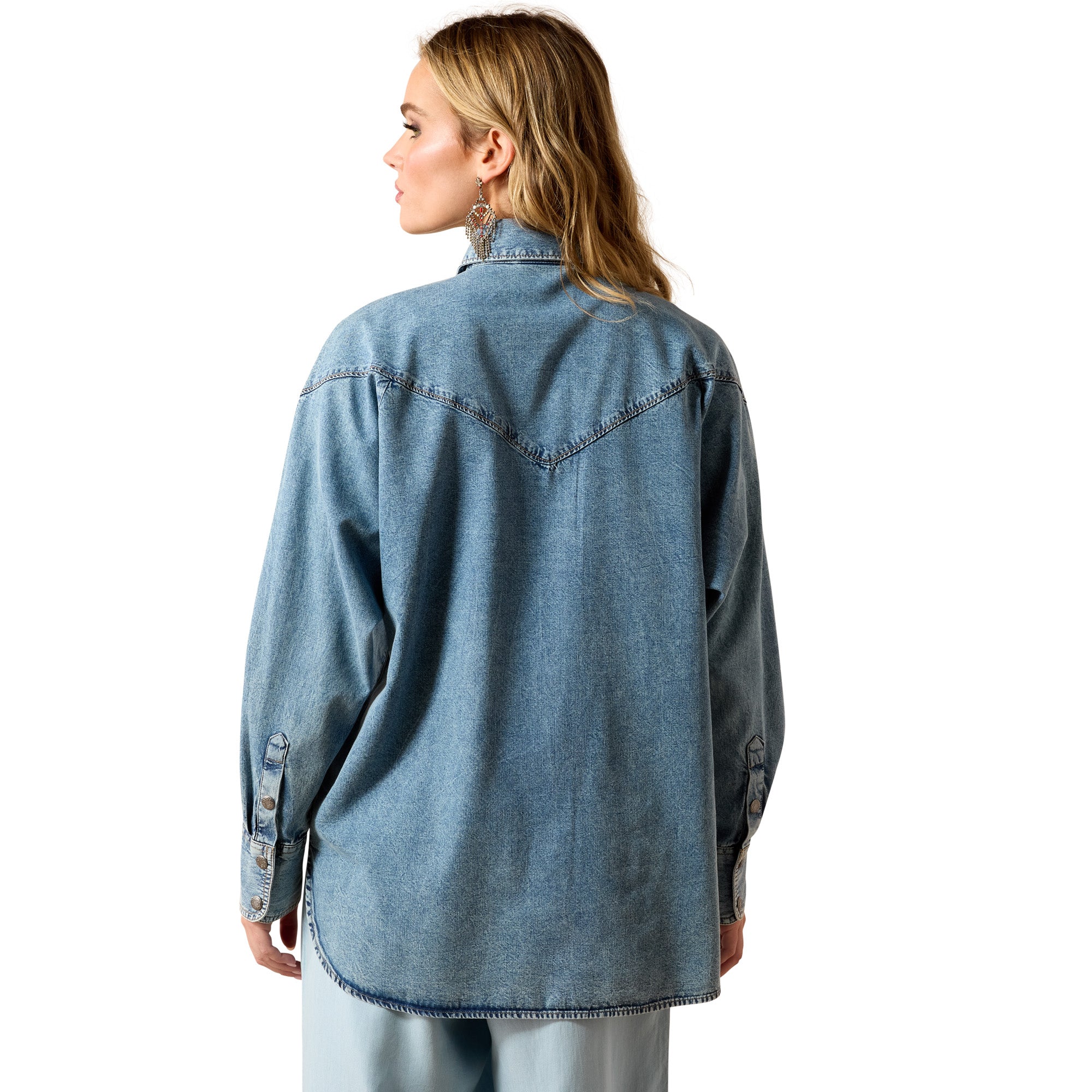 Oversized and laidback with a playful "borrowed from my boyfriend" vibe, this shirt has range. It looks great buttoned up and tucked into your favorite jeans or shorts, or worn open as a lightweight layer with a graphic tee or tank. Unique slanted pockets and snaps add playful Western charm.