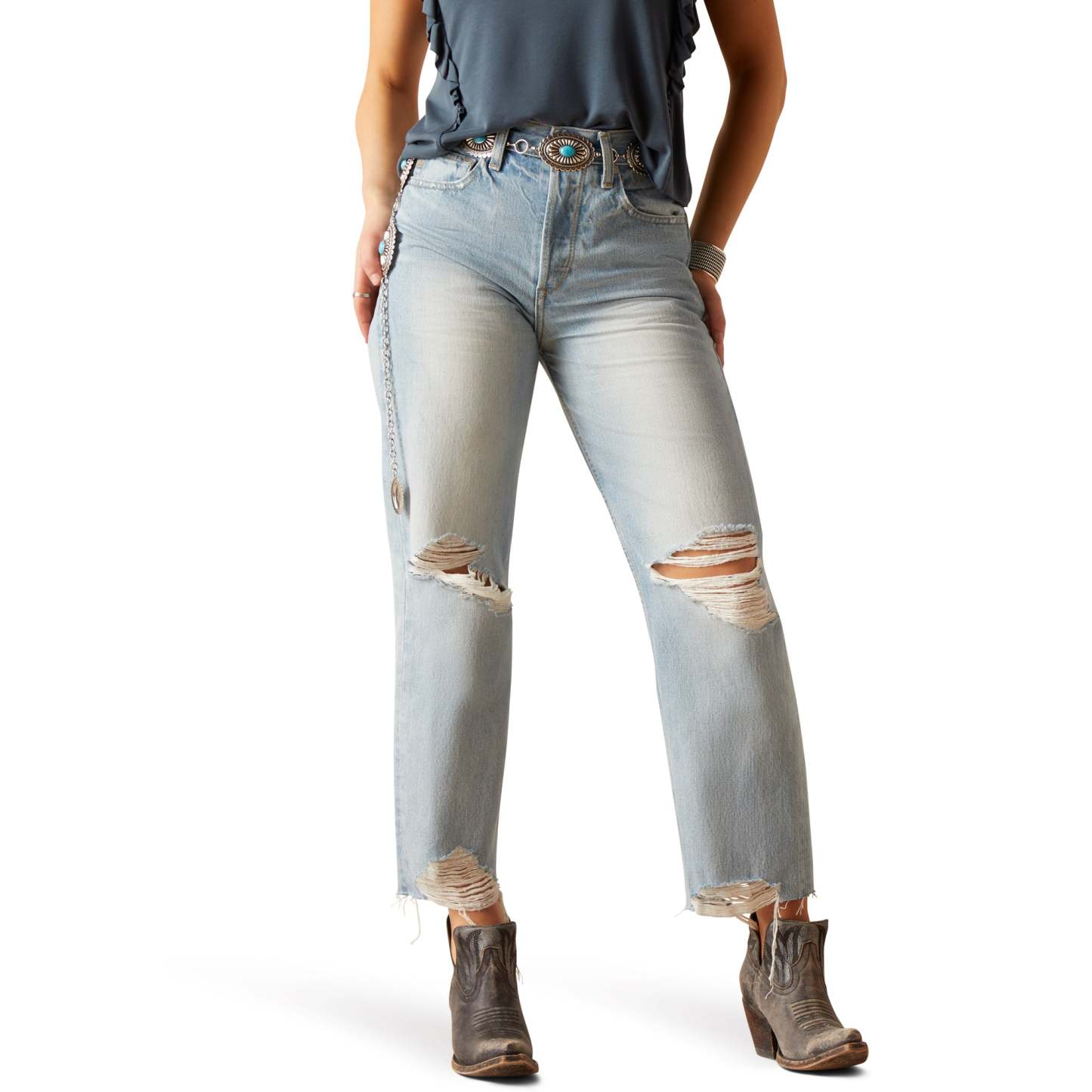 Ariat Womens Ultra High Rise Tomboy Mykonos JeansUnique destruction Button fly Fitted through hip and thigh Ultra high rise sits just above the small of the waist 12" front rise Straight crop leg fits perfectly with a bootie or casual shoe 27" inseam Classic non-stretch, rigid denim 100% Cotton Ring spun denim