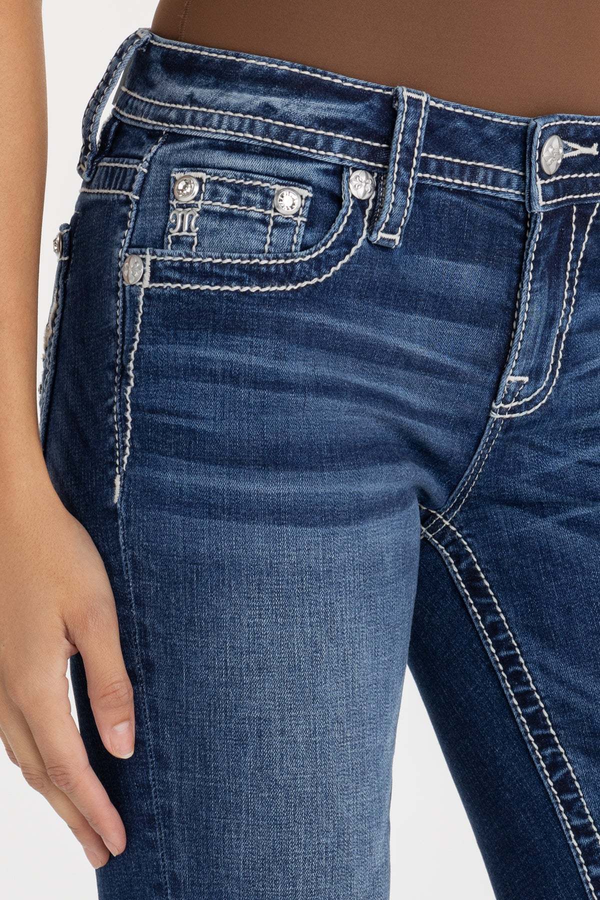 - Embossed white leather cross Miss Me brand patch