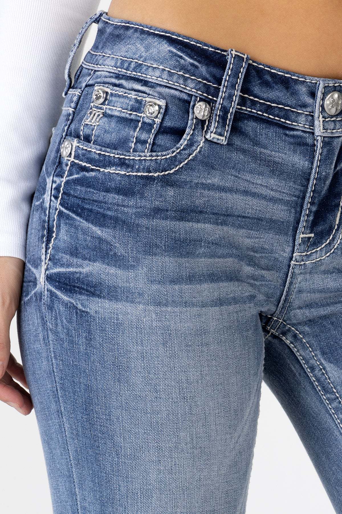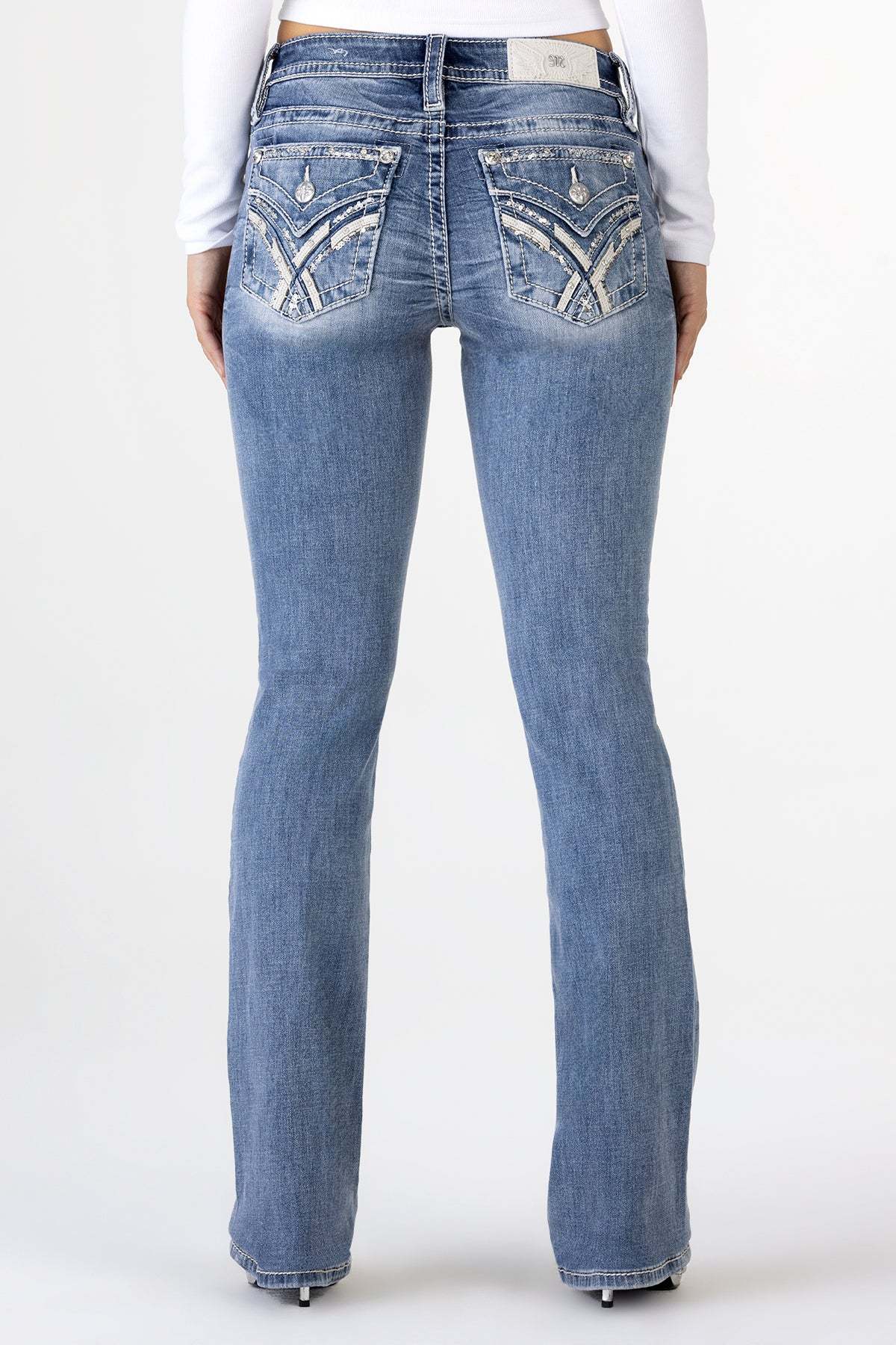 - Embossed white leather wing Miss Me brand patch