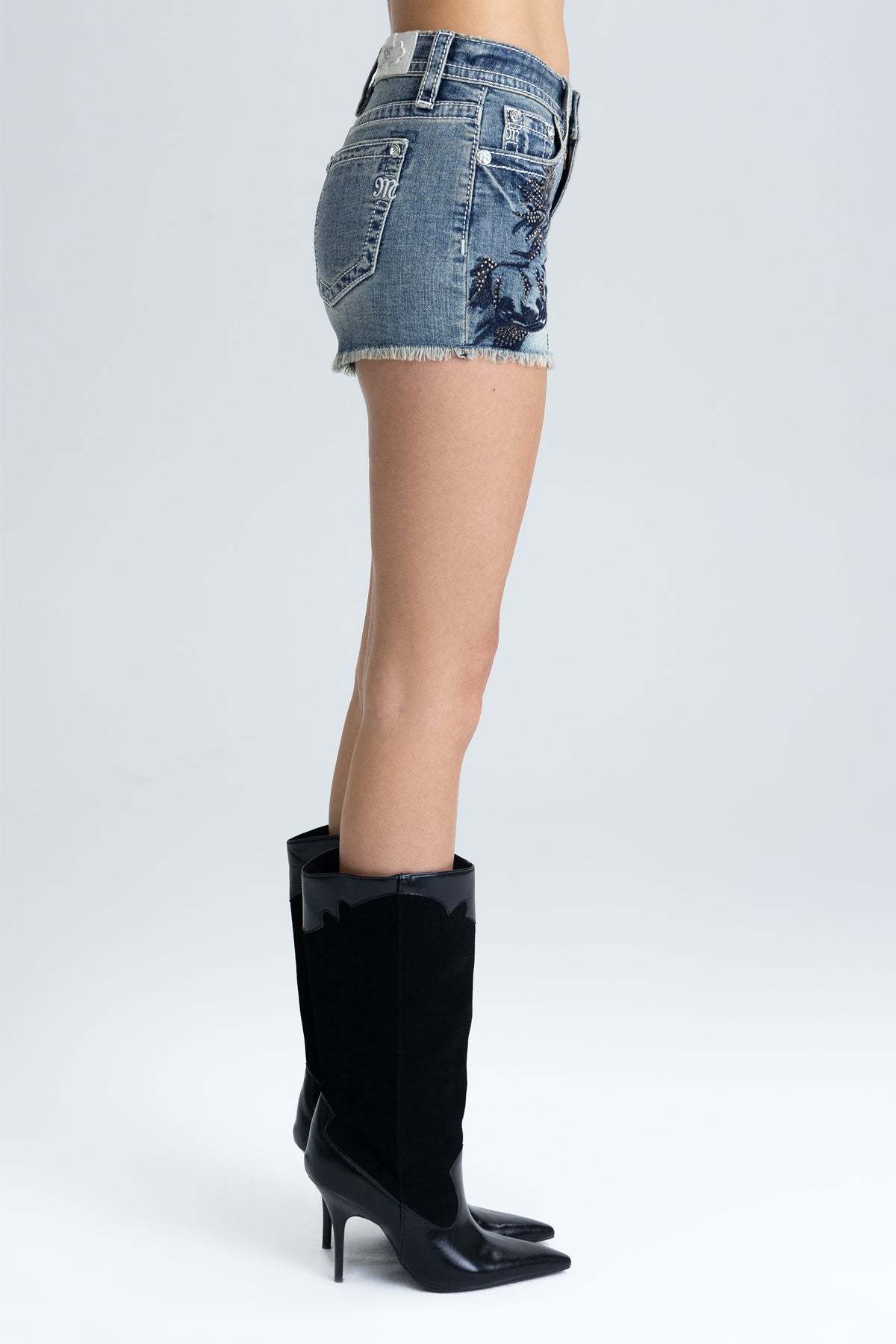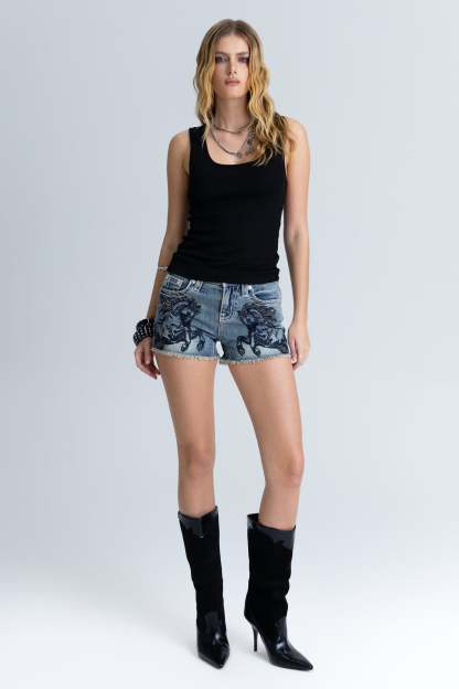 - Embroidered rearing horse designs with tonal rhinestone accents