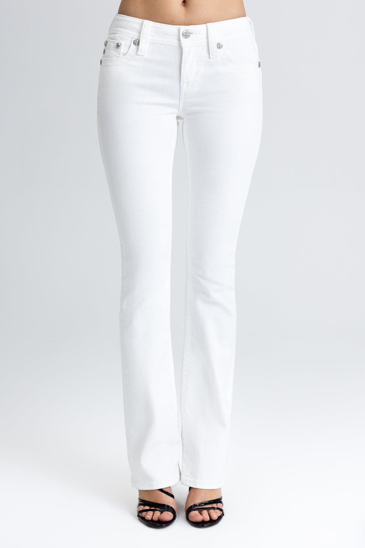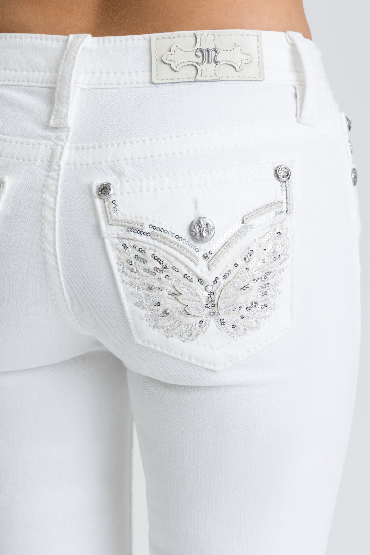 - Embossed white leather cross Miss Me brand patch