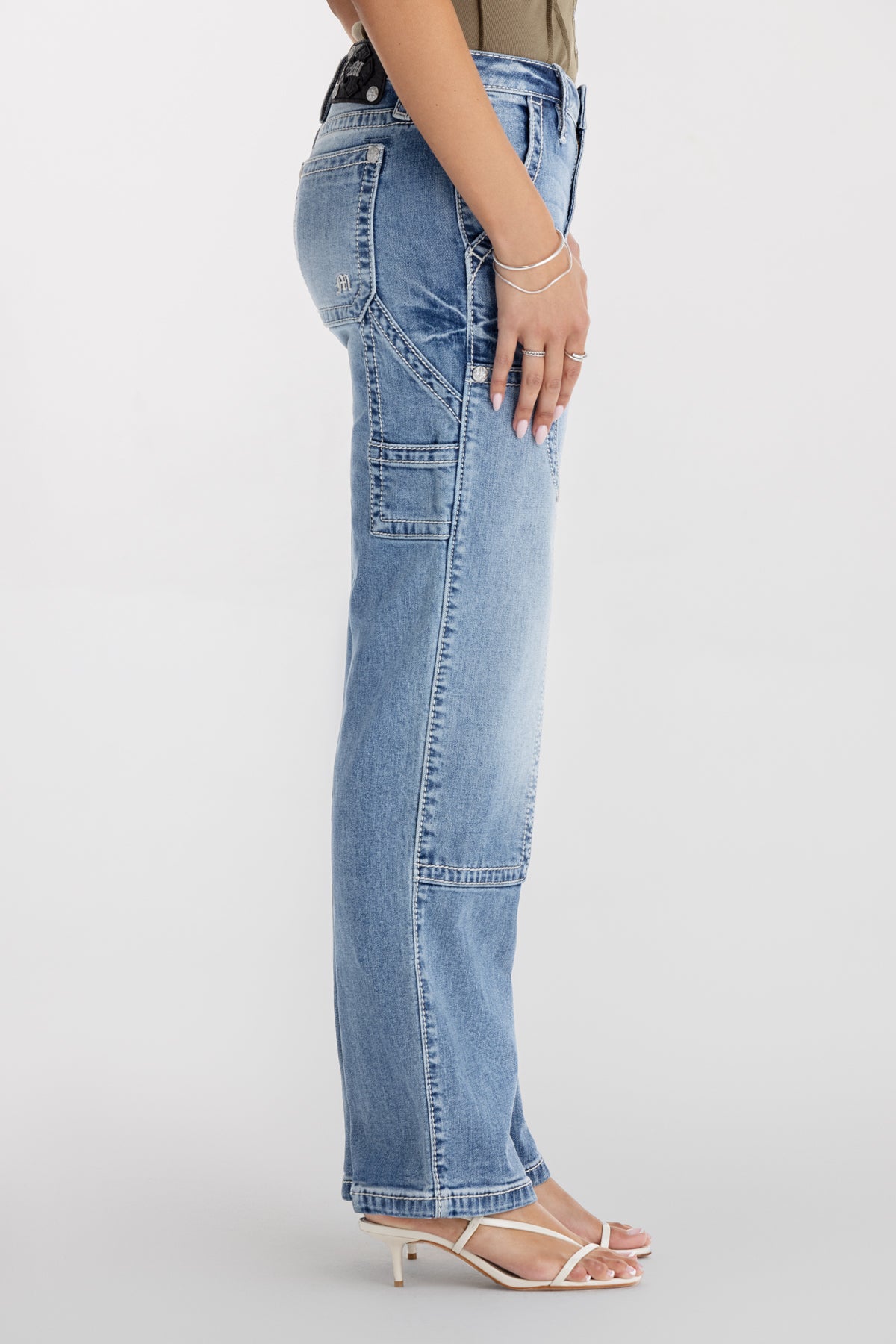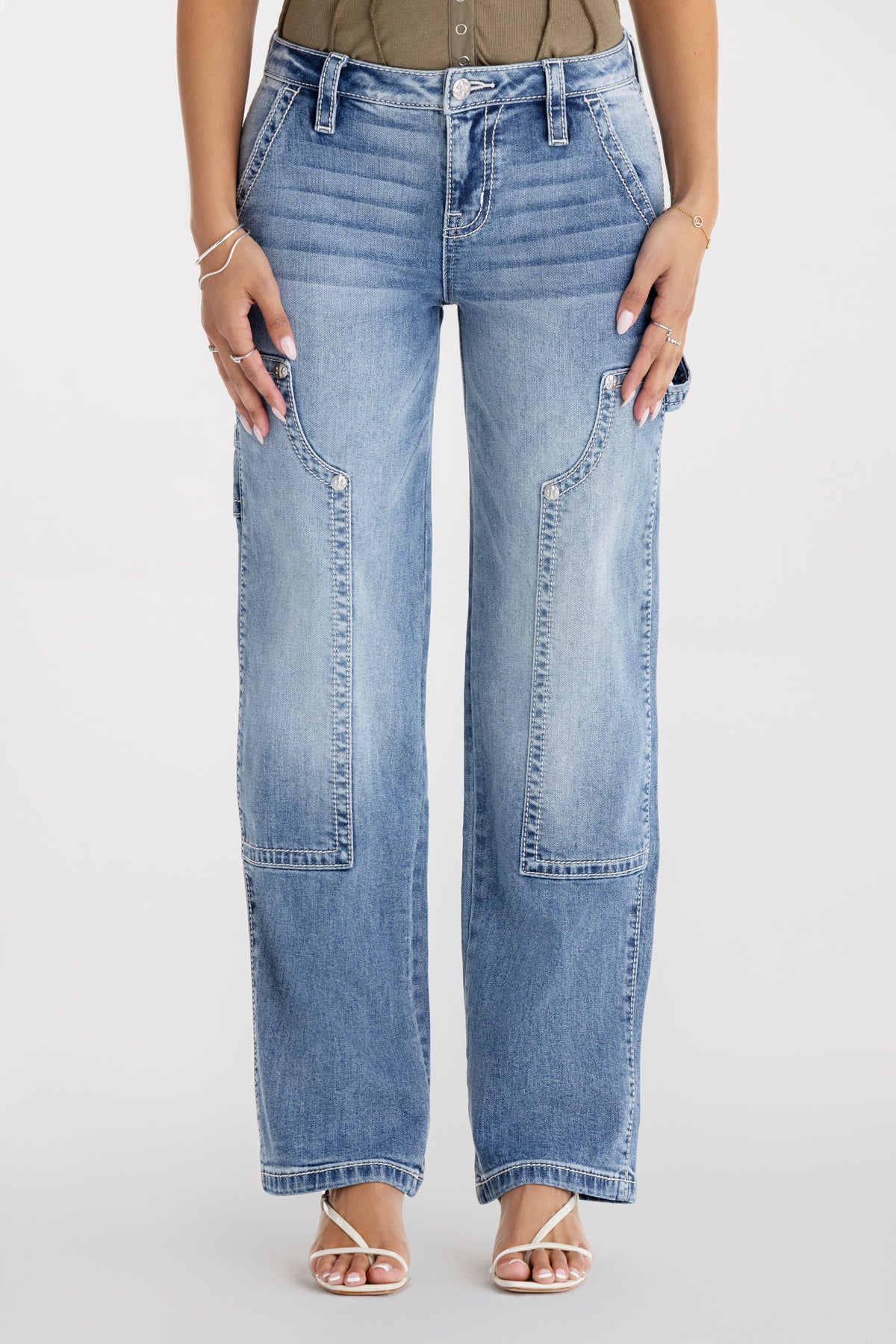 Washed, mid-rise slim-wide cargo jeans