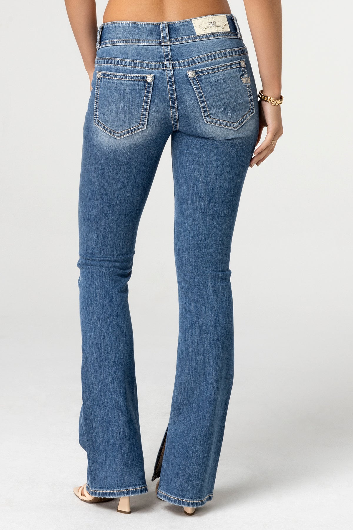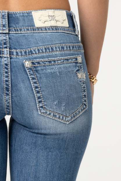 - Embroidered beige and silver mini winged Miss Me logo on standard back pocket