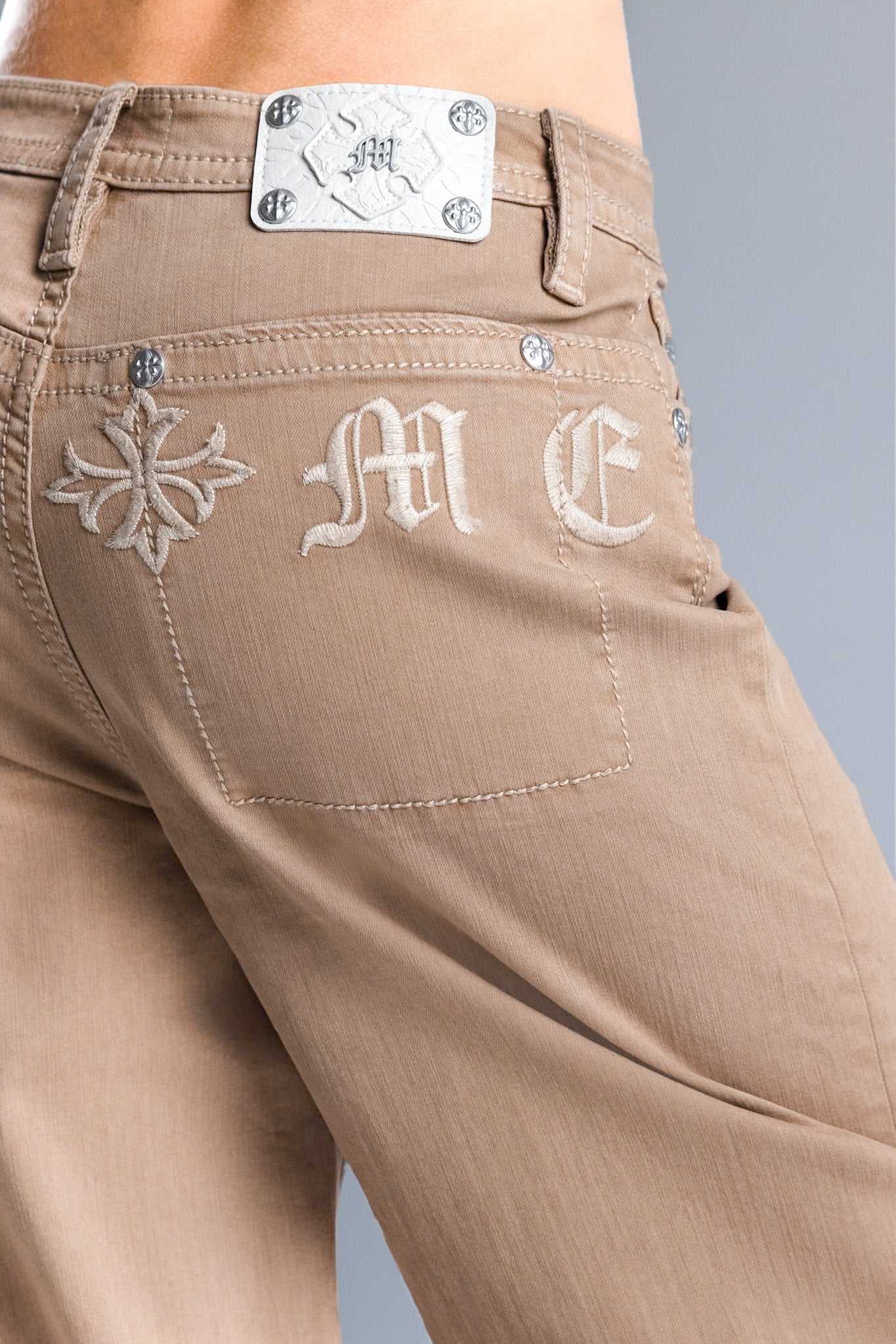 - Embossed white studded leather cross Miss Me brand patch
