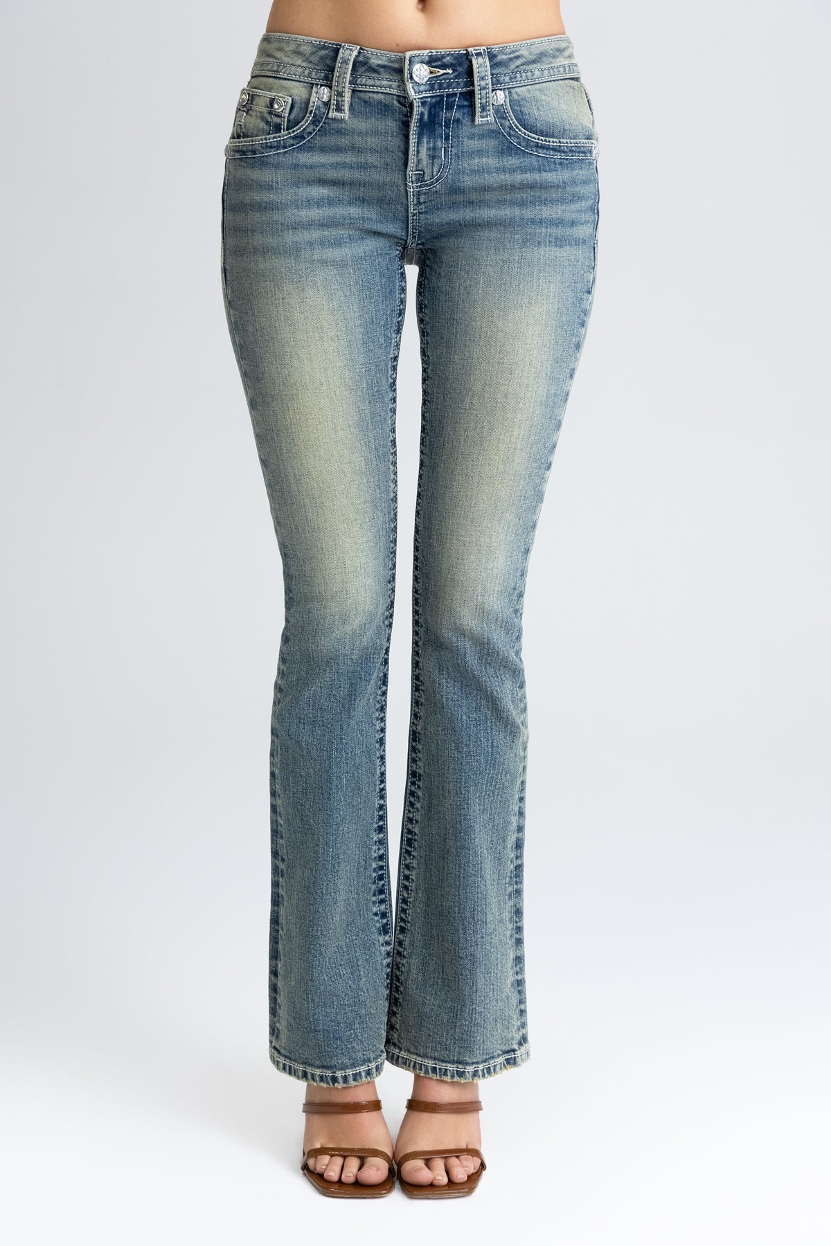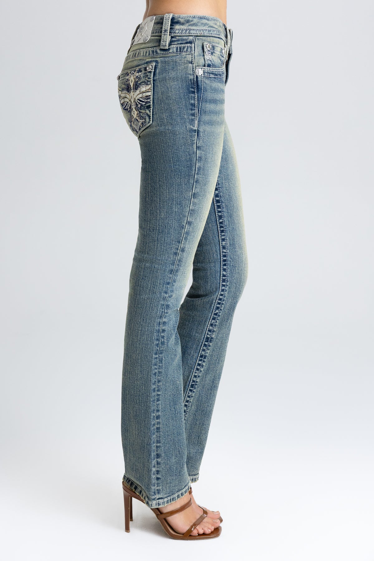 - Embossed white studded leather cross Miss Me brand patch
