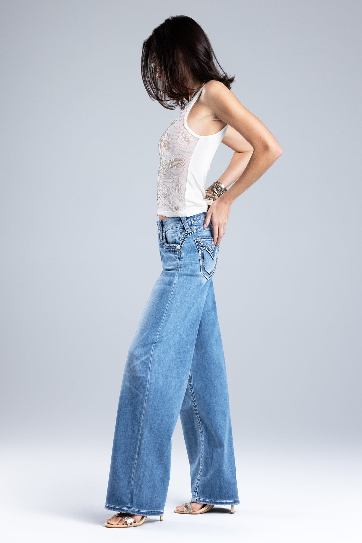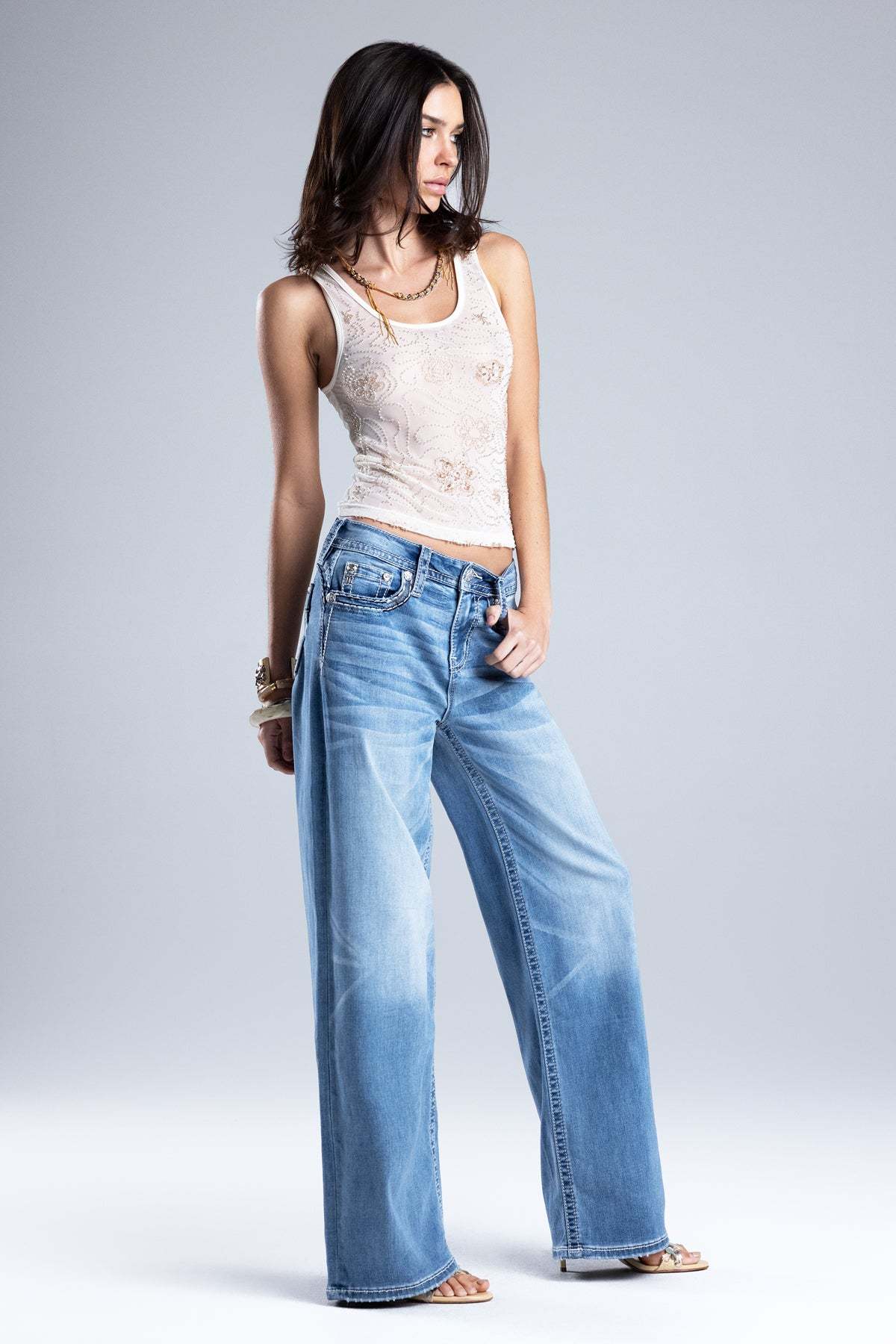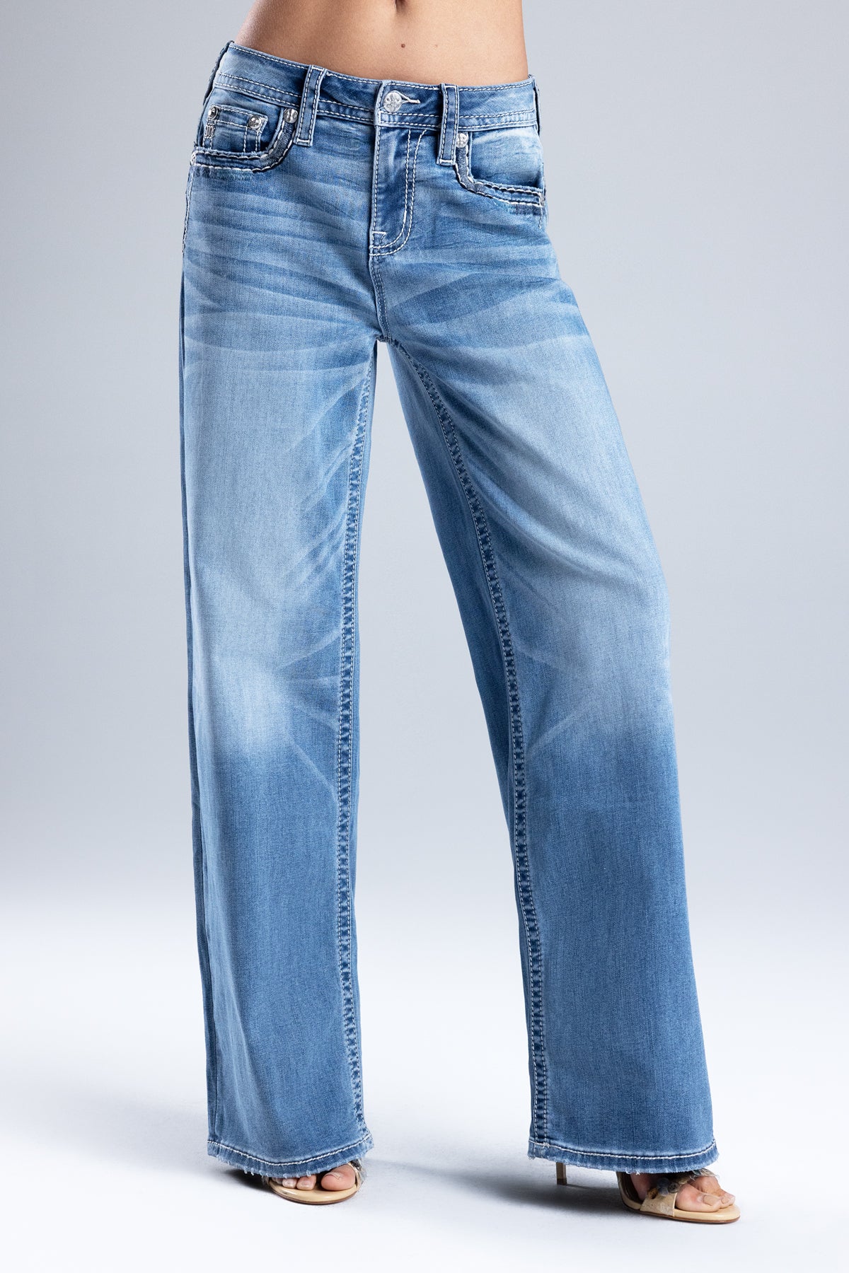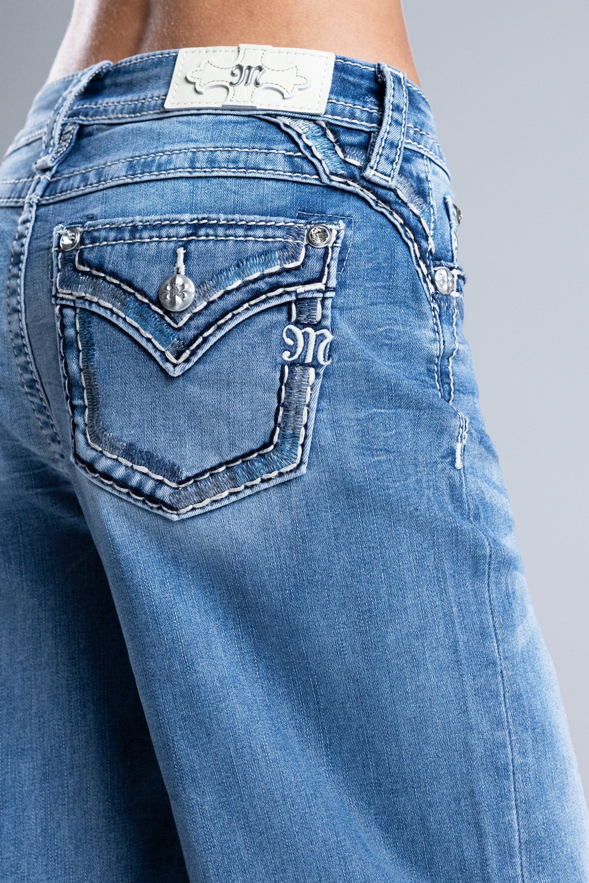 - Embossed white leather cross Miss Me brand patch