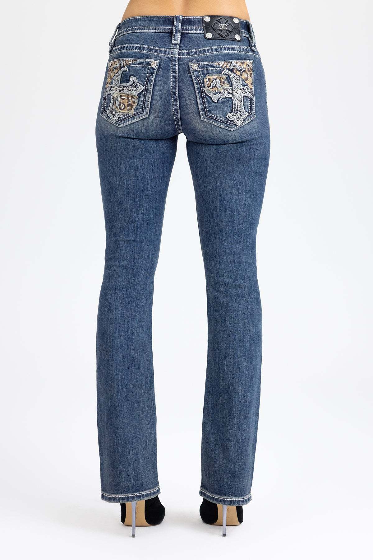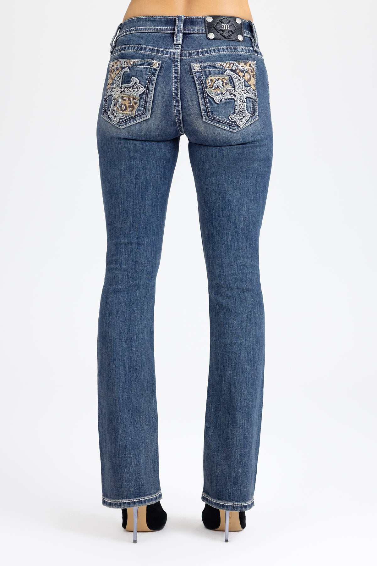 - Embossed black studded leather cross Miss Me brand patch