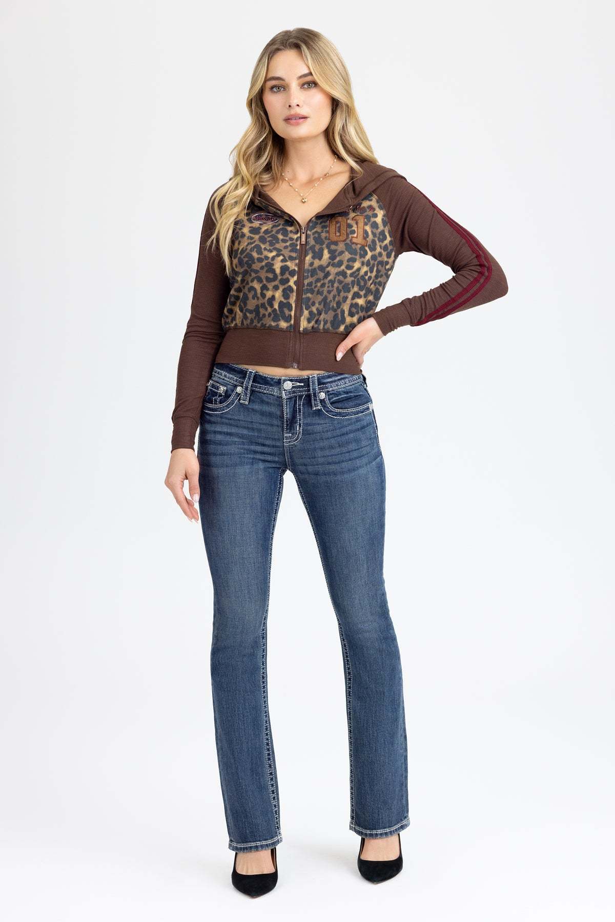 - Stitched leopard-pattern inset with sequin accents
