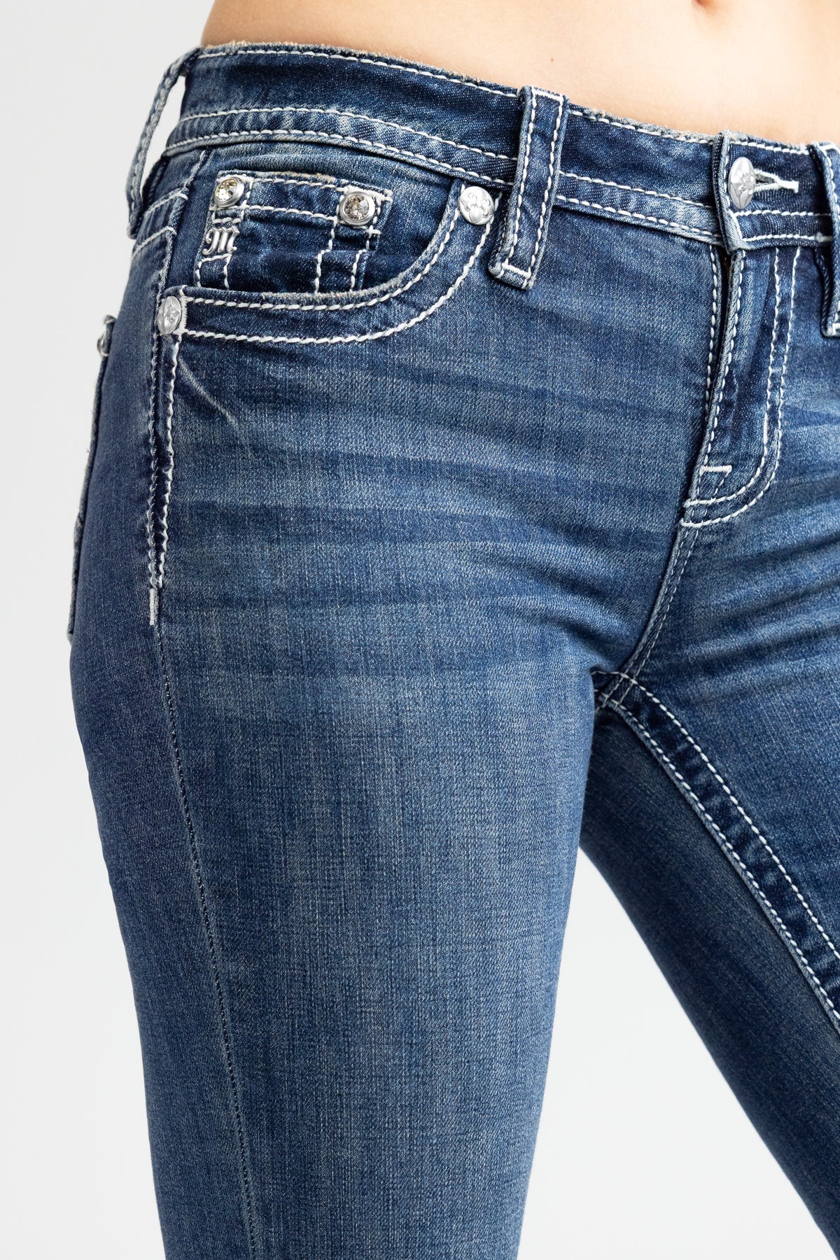 - Distressed detailing with rhinestone trim