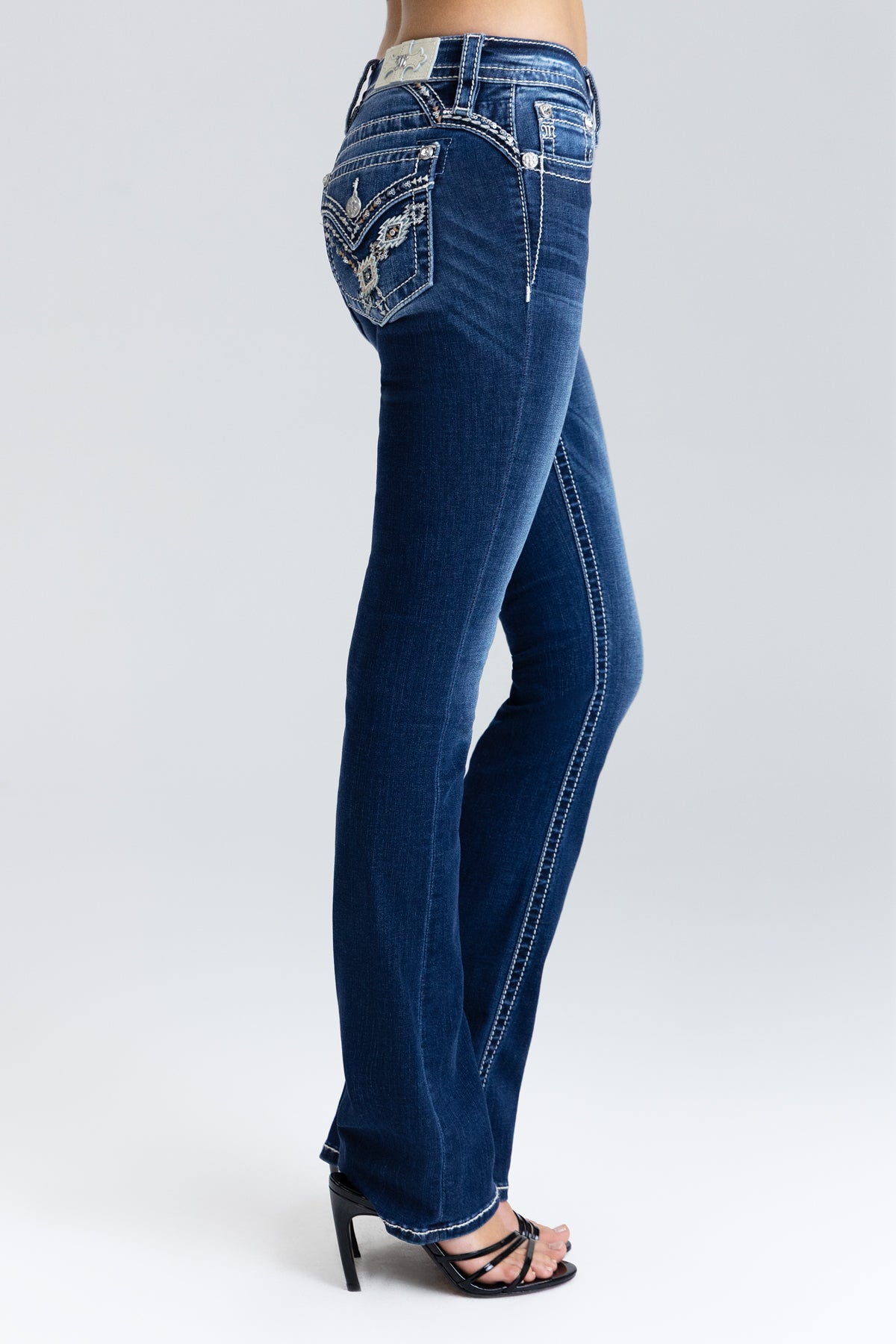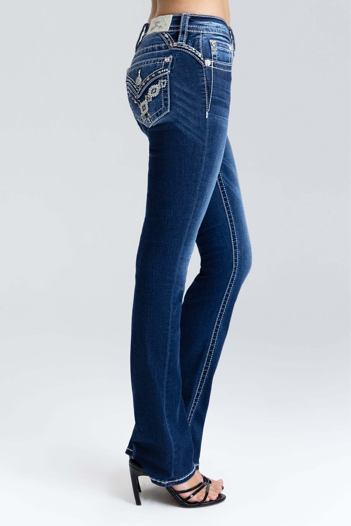 - Embossed white leather cross Miss Me brand patch