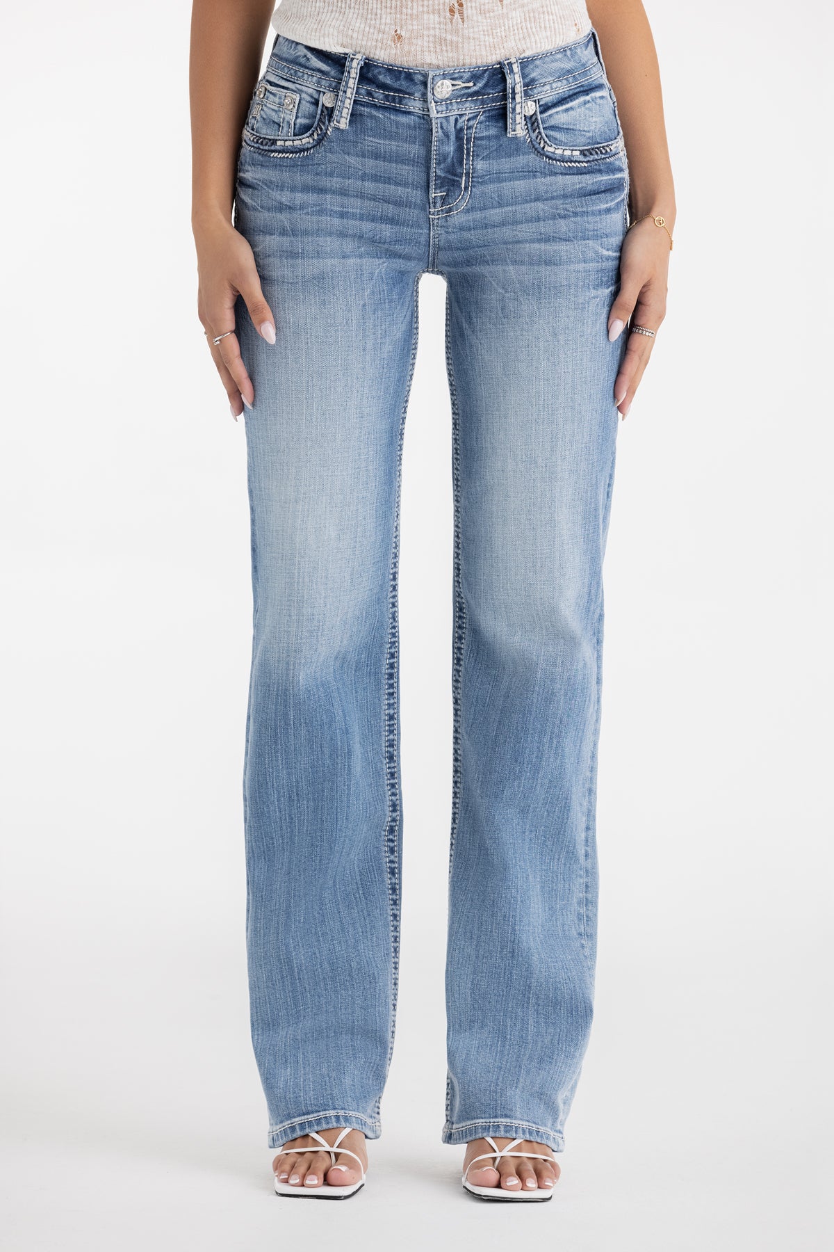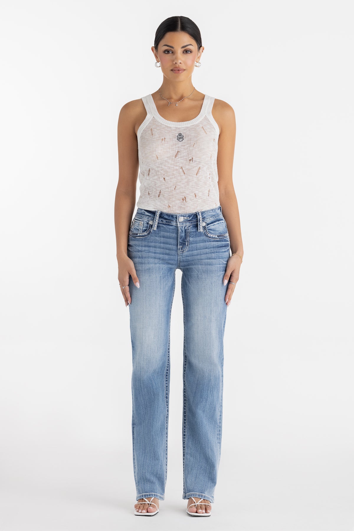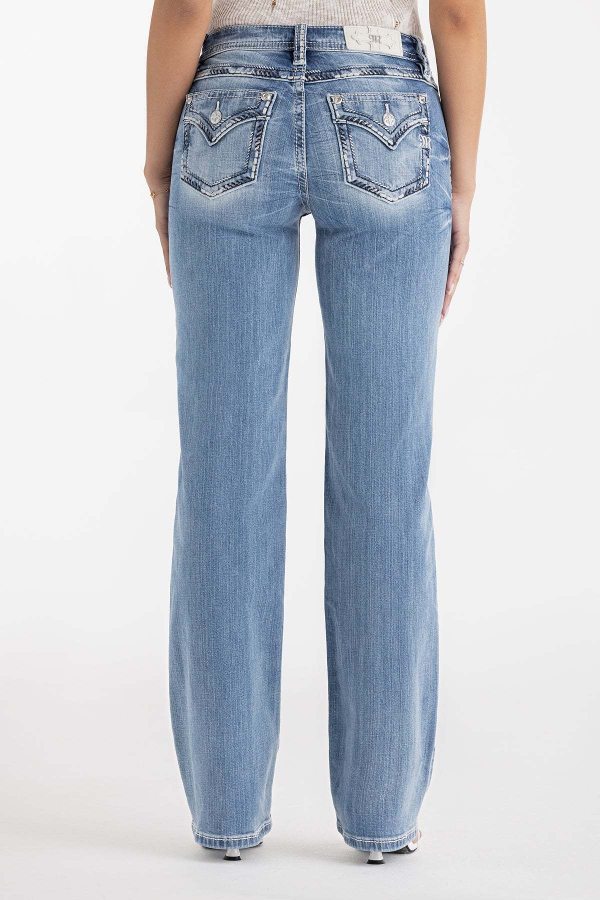 - Embossed white leather cross Miss Me brand patch