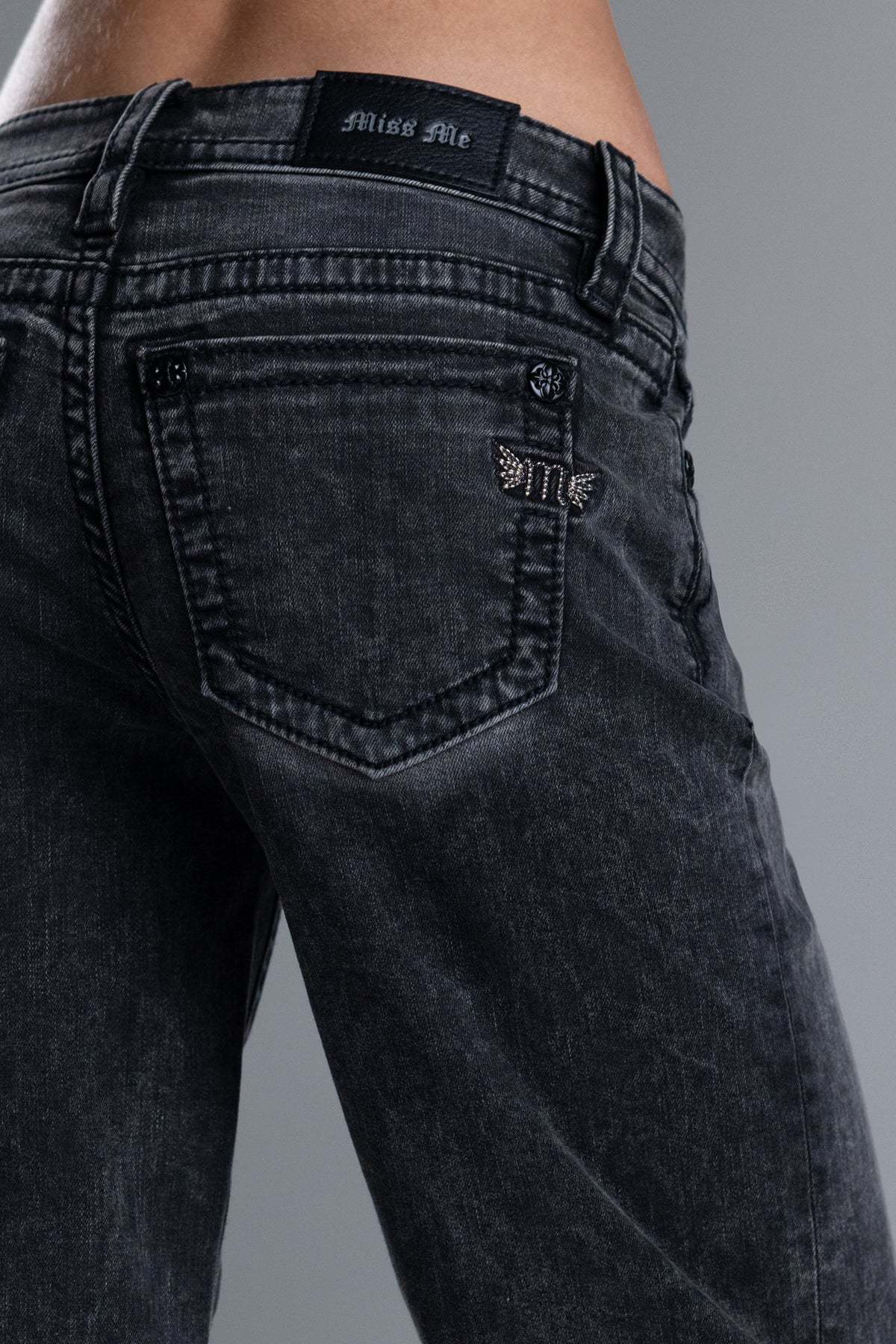 - Embroidered mini silver winged Miss Me logo